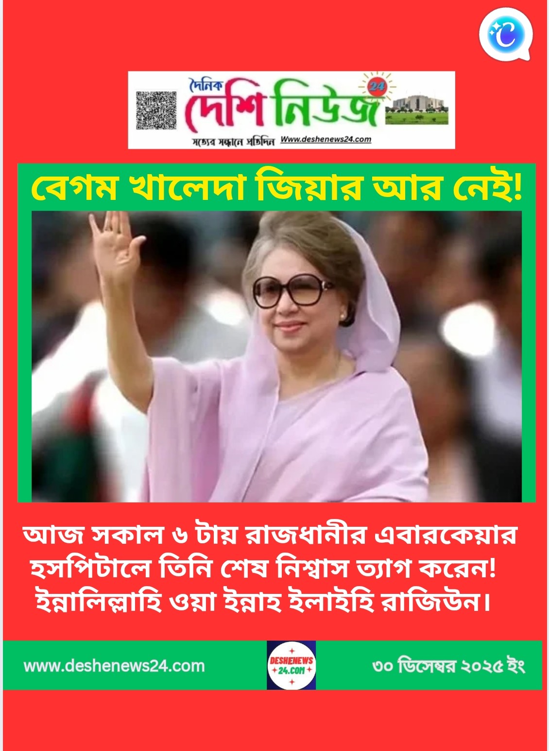 বাংলাদেশের মহীয়সী নারী বাংলাদেশের তিনবারের সাবেক প্রধানমন্ত্রী বেগম খালেদা জিয়া আজ ৩০ ডিসেম্বর ২০২৫ ইংরেজি সকাল ছয়টায় রাজধানীর এবারকেয়ার হসপিটালে…