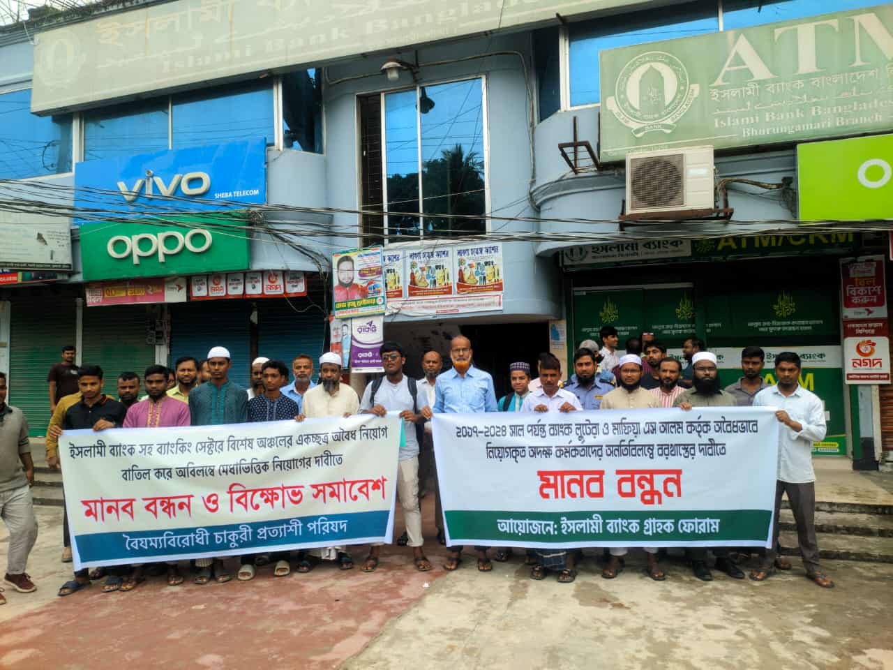 কুড়িগ্রামের ভূরুঙ্গামারীতে ইসলামী ব্যাংকে এস আলম গ্রুপের অবৈধভাবে নিয়োগপ্রাপ্ত অদক্ষ কর্মকর্তাদের নিয়োগ বাতিলের দাবিতে বিক্ষোভ সমাবেশ ও মানববন্ধন করেছে বৈষম্যবিরোধী চাকরিপ্রত্যাশী ও ইসলামী ব্যাংক গ্রাহক ফোরাম।