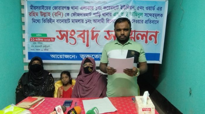 মীরসরাই উপজেলার জোরারগঞ্জ থানার ১নং ইউনিয়নের সরকার তালুক এলাকার বাসিন্দা আলিম উল্ল্যা ফারুক এক সংবাদ সম্মেলনে অভিযোগ করেছেন যে, তার ছোট ভাই রহিম উল্ল্যাহকে গত ৩ অক্টোবর (শুক্রবার) বিকেল ৪টার দিকে কয়েকজন ব্যক্তি জোরপূর্বক ঘর থেকে ধরে নিয়ে গেছে, যাদের মধ্যে পুলিশের পোশাকধারী ও সাধারণ পোশাকের লোকজন ছিল।দুইদিন পর ২০ হাজার টাকা নিয়ে ছেড়ে দেয়ার আস্বাস দিয়ে পরদিন মিথ্যা একটি চুরি মামলা দেখিয়ে কোর্টে চালান করে দেয়।