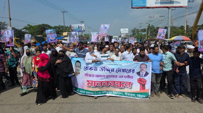 সীতাকুণ্ডের ১০ নং সলিমপুর ইউনিয়নের জনপ্রিয় রোকন উদ্দিন মেম্বারের দলীয় পদ বহিস্কারাদেশ প্রত্যাহারের দাবীতে মানববন্ধন করেছে সলিমপুরের নারী,পুরুষ,কিশোর,যুবক।