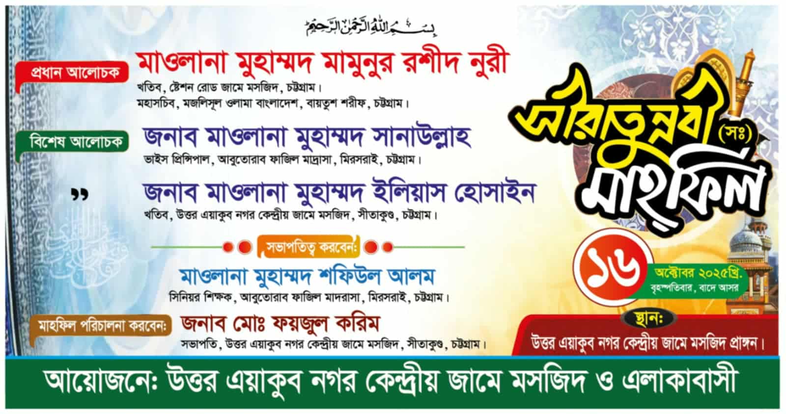 আজ বৃহশপতিবার বাদ আছর থেকে সীতাকুণ্ড এয়াকুব নগর কেন্দ্রীয় জামে মসজিদে এলকাবাসীর উদ্যোগে এক সীরাতুন্নবী ( সঃ) মাহফিল অনুষ্ঠিত হবে।