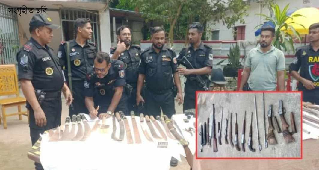 চট্টগ্রামের রাউজানের নোয়াপাড়া ইউনিয়নের এক গিয়াস কাদের চৌধুরীর কর্মীর বাড়ি থেকে উদ্ধার করা অস্ত্র