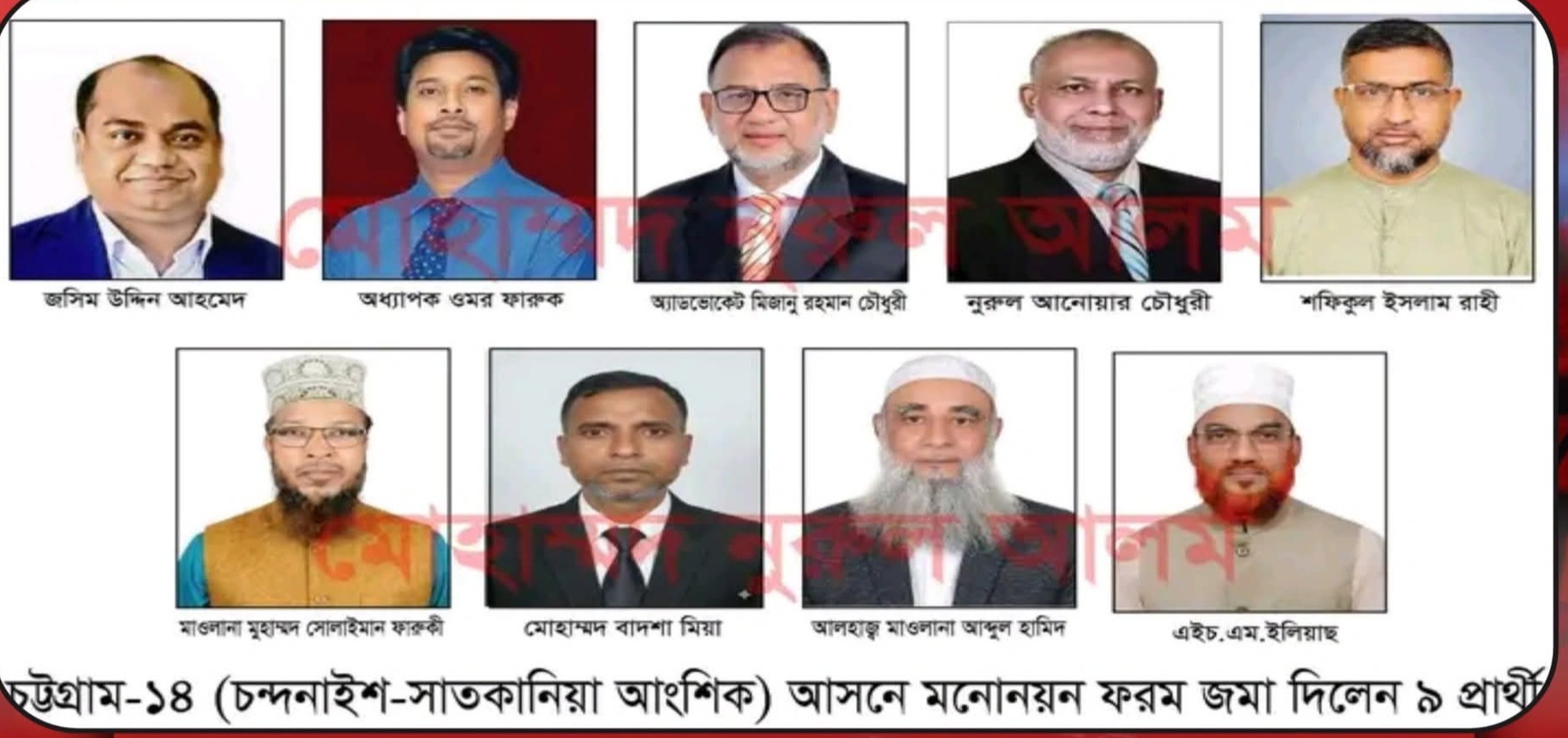 আসন্ন জাতীয় সংসদ নির্বাচনে চট্টগ্রাম-১৪ (চন্দনাইশ-সাতকানিয়া আংশিক) সংসদীয় আসন থেকে বিভিন্ন রাজনৈতিক দল ও স্বতন্ত্র প্রার্থী হিসেবে মোট ৯ জন প্রার্থী তাদের মনোনয়নপত্র দাখিল করেছেন।