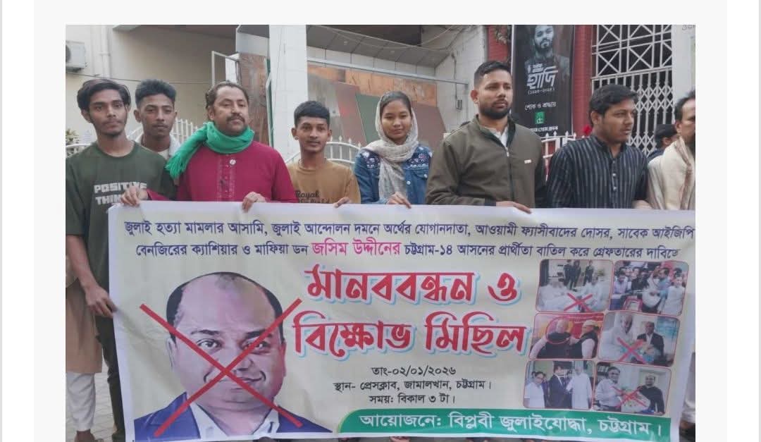 জুলাই হত্যা মামলার আসামি ও আওয়ামী ফ্যাসীবাদের দোসর উল্লেখ করে চট্টগ্রাম-১৪ আসনে জসিম উদ্দিনের প্রার্থিতা বাতিলের দাবিতে বিপ্লবী জুলাই যোদ্ধা চট্টগ্রামের ব্যানারে মানববন্ধন করা হয়েছে। শুক্রবার (২ জানুয়ারি) বিকেল তিনটায় চট্টগ্রাম প্রেস ক্লাব চত্বরে এই মানববন্ধন ও বিক্ষোভ অনুষ্ঠিত হয় ।