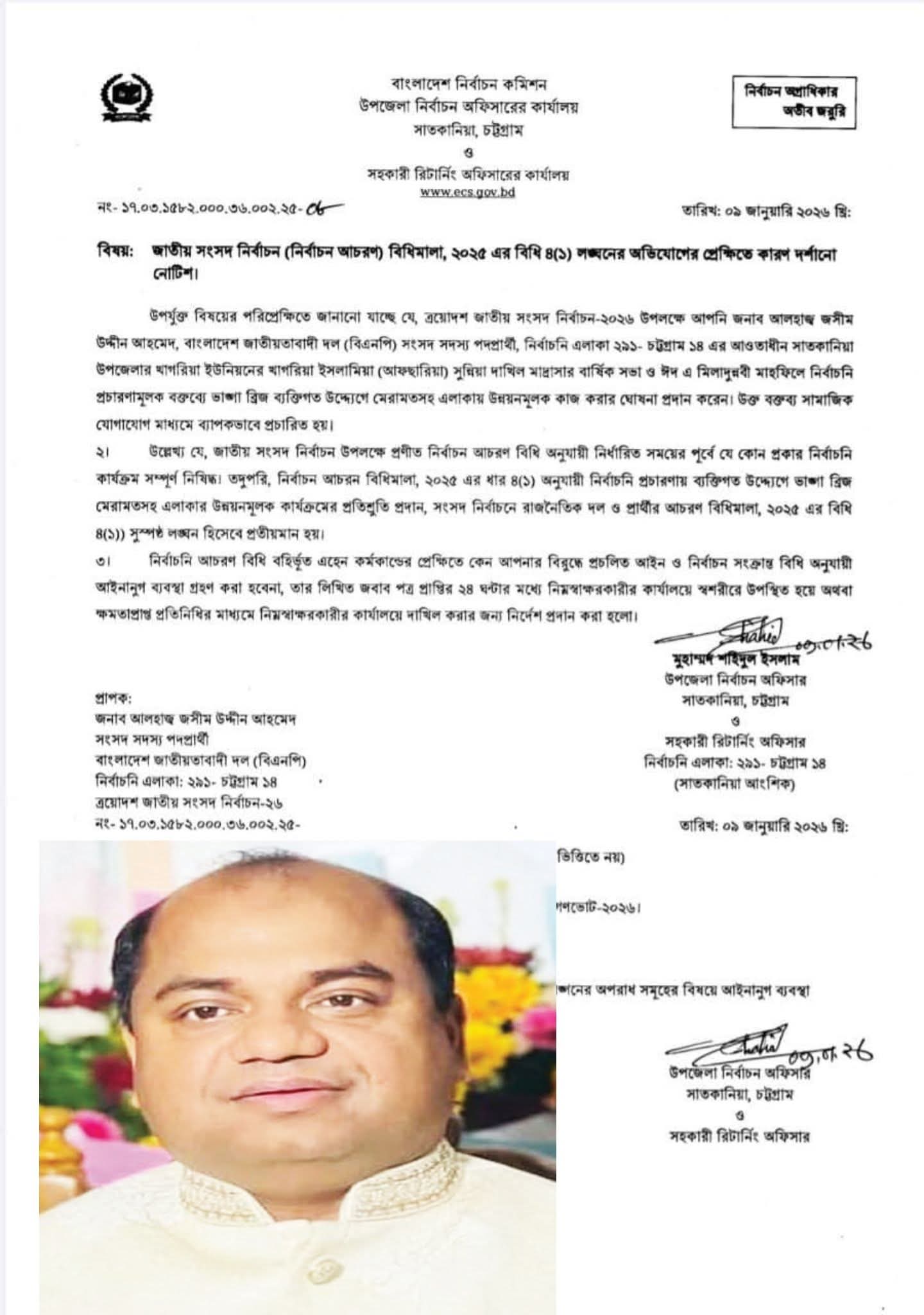 নির্বাচনি আচরণ বিধি বহির্ভূত এহেন কর্মকান্ডের প্রেক্ষিতে কেন আপনার বিরুদ্ধে প্রচলিত আইন ও নির্বাচন সংক্রান্ত বিধি অনুযায়ী আইনানুগ ব্যবস্থা গ্রহণ করা হবেনা, তার লিখিত জবাব পত্র প্রাপ্তির ২৪ ঘন্টার মধ্যে নিম্নস্বাক্ষরকারীর কার্যালয়ে স্বশরীরে উপস্থিত হয়ে অথবা ক্ষমতাপ্রাপ্ত প্রতিনিধির মাধ্যমে নিম্নস্বাক্ষরকারীর কার্যালয়ে দাখিল করার জন্য নির্দেশ প্রদান করা