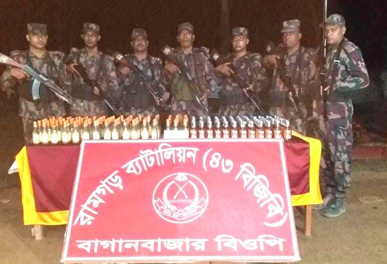 গতকাল বৃহস্প্রতিবার গভীর রাতে রামগড় ৪৩ বিজিবির আওতায় বাগানবাজার বিওপিতে কর্মরত নায়েক সুবেদার মোঃ জাহানুর ইসলাম এর নেতৃত্বে একটি টহল দল কর্তৃক এই মদ জব্দ করা হয়।