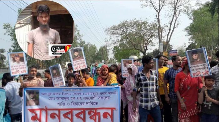 সোমবার দুপুরে লালমনিরহাট-বুড়িমারী মহাসড়কের দুল্লার বাজার এলাকায় নূরে আলম হত্যা মামলায় জড়িত ব্যক্তিদের গ্রেফতার ও ফাঁসির দাবি জানিয়ে মানববন্ধন করেছে তার পরিবার ও এলাকাবাসী।