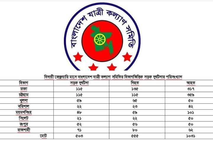 বিদায়ী ফেব্রুয়ারি মাসে ৫৪৬ দুর্ঘটনায় ৫৯৯ জন নিহত, আহত হয়েছেন ১০৯৯ জন।