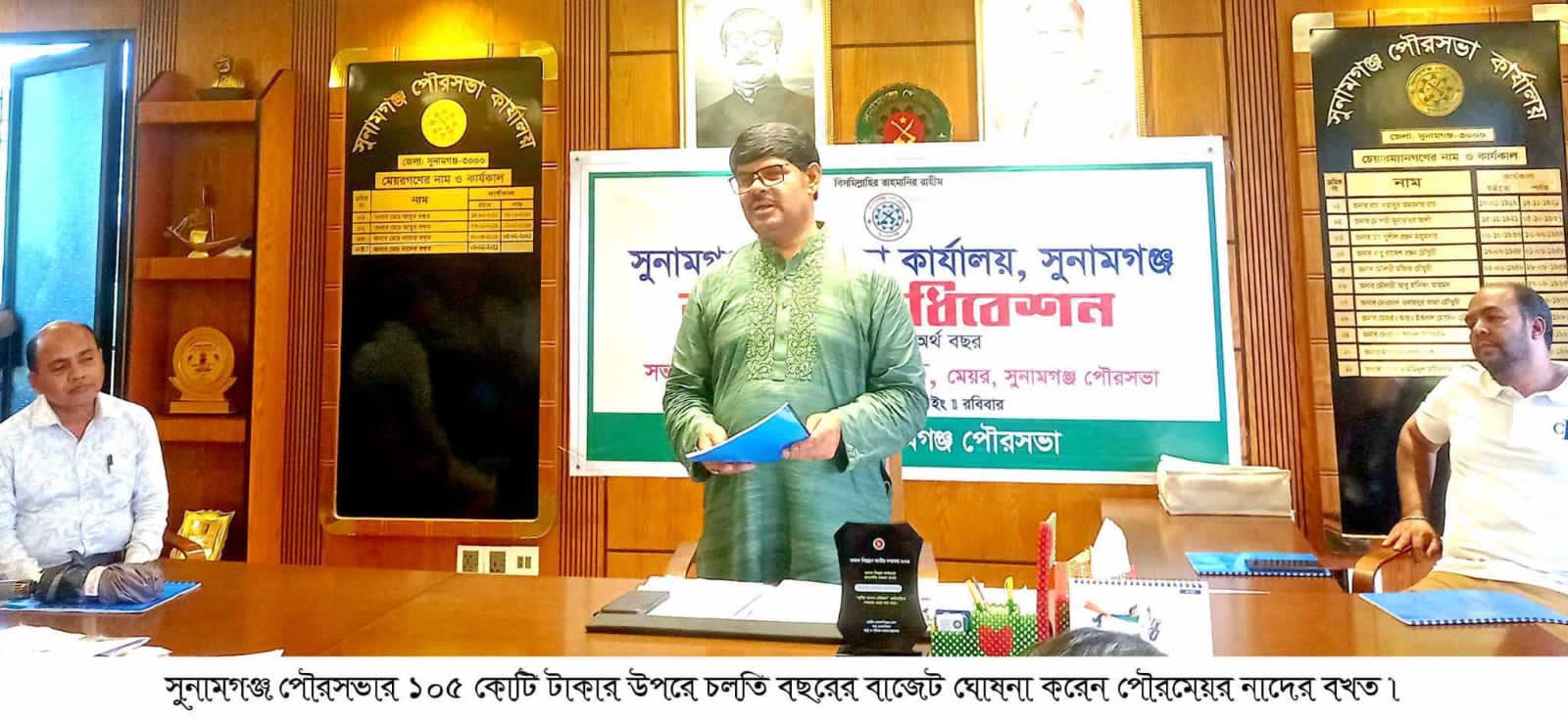 মেয়র নাদের বখতের সভাপতিত্বে ও পৌরসভার হিসাব রক্ষণ কর্মকর্তা বাবু সন্তোষ কুমার দাসের সঞ্চালনায় বাজেট অধিবেশনে বক্তব্যে রাখেন সুনামগঞ্জ সরকারী কলেজের সাবেক অধ্যক্ষ পরিমল কান্তি দে,শিক্ষাবিদ যোগেশ্বর দাস,ষোলঘরস্থ রামকৃষ্ণ আশ্রমের মহারাজ স্বামী হৃদয়ানন্দ মহারাজ,জেলা আওয়ামীলীগের সহ সভাপতি এড. চাঁন মিয়া,এড.নজরুল ইসলাম,পৌরসভার নির্বাহী প্রকৌশলী কালীকৃষ্ণ পাল,এড.পরিতোষ বাবু,এড.বিমান কান্তি রায়,জেলা মহিলা সংস্থার সভানেত্রী গৌরী ভট্রাচার্য্য,পৌর কাউন্সিলর সাবেরীন সাবু,মোশারফ হোসেন,সুবিমল চক্রবর্তী,মহিলা কাউন্সিলর সৈয়দ জাহানারা বেগম,আর ডি এস এ এর নির্বাহী পরিচালক মোঃ মিজানুল হক সরকার প্রমুখ।