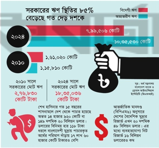 ১৮ লাখ ৩৫ হাজার কোটি টাকার সরকারি ঋণ রেখে দেশ ছেড়ে পালিয়েছে সদ্য ক্ষমতাচ্যুত স্বৈরাচার হাসিনা। দেশী ও বিদেশী উৎস থেকে এ ঋণ নেয়া হয়েছে। অথচ ২০০৯ সালে হাসিনা যখন ক্ষমতা গ্রহণ করে, তখন সরকারের ঋণ স্থিতি ছিল মাত্র ২ লাখ ৭৬ হাজার ৮৩০ কোটি টাকা। সে হিসাবে আওয়ামী লীগের দেড় দশকের শাসনামলেই সরকারের ঋণ স্থিতি ১৫ লাখ ৫৮ হাজার ২০৬ কোটি টাকা বেড়েছে, যা সরকারের মোট ঋণের প্রায় ৮৫ শতাংশ। অর্থ মন্ত্রণালয়ের তথ্যে গত দেড় দশকে সরকারের অস্বাভাবিক ঋণ বৃদ্ধির এ চিত্র উঠে এসেছে।
