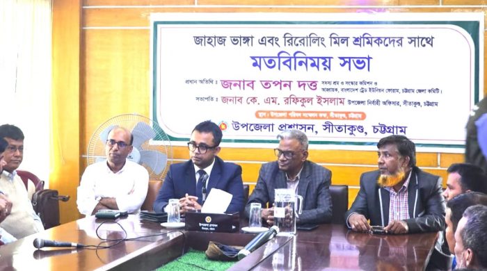 আজ রবিবার ২২ ডিসেম্বর সকাল ১০টায় সীতাকুণ্ড উপজেলা পরিষদ এর সম্মেলন কক্ষে বাংলাদেশ ইনস্টিটিউট অব লেবার স্টাডিজ-বিলস এর উদ্যোগে জাহাজভাঙা শ্রমিক ট্রেড ইউনিয়ন ফোরামের সাথে জাহাজভাঙা সেক্টর সংক্রান্ত এক পর্যালোচনা সভা অনুষ্ঠিত হয়। ফোরামের সভাপতি শ্রমিকনেতা তপন দত্তের সভাপতিত্বে এবং বিলস-ডিটিডিএ প্রকল্পের অধীনে জাহাজভাঙা শ্রমিকদের পেশাগত স্বাস্থ্য ও নিরাপত্তা বিষয়ক তথ্য কেন্দ্রের সমন্বয়ক ফজলুল কবির মিন্টুর সঞ্চালনায় অনুষ্ঠিত উক্ত পর্যালোচনা সভায় বক্তব্যে প্রধান অতিথির বক্তব্য রাখেন সীতাকুণ্ড উপজেলা নির্বাহী অফিসার (ইউএনও) কে এম রফিকুল ইসলাম। বিশেষ অতিথির বক্তব্য রাখেন ফোরামের যুগ্ম আহ্বায়ক এবং জাতীয়তাবাদী শ্রমিকদল চট্টগ্রাম বিভাগীয় সভাপতি এ এম নাজিম উদ্দিন, জাতীয়তাবাদী শ্রমিক দলের সাংগঠনিক সম্পাদক শ ম জামাল, বাংলাদেশ ট্রেড ইউনিয়ন কেন্দ্র চট্টগ্রাম জেলার সাধারণ সম্পাদক মসিউদ্দৌলা, বাংলাদেশ মুক্ত শ্রমিক ফেডারেশন চট্টগ্রাম জেলার সাধারণ সম্পাদক নুরুল আবসার, জাহাজভাঙা শ্রমিক ট্রেড ইউনিয়ন ফোরামের সদস্য মাহাবুবুল আলম, জাতীয় শ্রমিক ফেডারেশন চট্টগ্রাম জেলার সাধারণ সম্পাদক দিদারুল আলম চৌধুরী, বাংলাদেশ মেটাল ওয়ার্কার্স ফেডারেশন কেন্দ্রীয় কমিটির যুগ্ম সম্পাদক মোঃ আলী, বাংলাদেশ মুক্ত শ্রমিক ফেডারেশনের যুগ্ম সম্পাদক মোঃ ইদ্রিছ প্রমুখ।