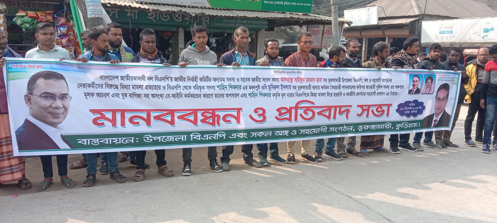 কুড়িগ্রামের ভূরুঙ্গামারীতে ২২ ডিসেম্বর রবিবার সকাল ১১ টায় উপজেলা বিএনপি ও অংগ সংগঠনের ব্যানারে বাংলাদেশ জাতীয়তাবাদী দল বিএনপির জাতীয় নির্বাহী কমিটির অন্যতম সদস্য ও সাবেক জাতীয় সংসদ সদস্য আলহাজ্ব সাইফুর রহমান রানাসহ উপজেলা বিএনপির অংগ সংগঠনের নেতা কর্মীদের বিরুদ্ধে মিথ্যা মামলা প্রত্যাহার ও বহিস্কৃত উপজেলা সাধারণ সম্পাদক শাহিন সিকদারের মদদপুষ্ট ওসি মুনিরুল ইসলামসহ ভূরুঙ্গামারী থানায় কর্মরত স্বৈরাচারী শাসনামলের কতিপয় আওয়ামী পুলিশ সদস্য এর পক্ষপাত মূলক আচরণ ও ঘুষ বানিজ্যসহ অসংখ্য বেআইনি কর্মকান্ডের কারনে তাদের অপসারন ও শাহিন সিকদার কর্তৃক মুল ধারার বিএনপিকে মিথ্যা মামলা দিয়ে হয়রানি ও ভয়ভীতি প্রদর্শনের সহযোগী প্রশাসনের বিরুদ্ধে ব্যানারে লিখে মানববন্ধন ও প্রতিবাদ সভা করেন বিএনপিসহ সকল অংগ ও সহযোগী সংগঠনের নেতা কর্মীরা।