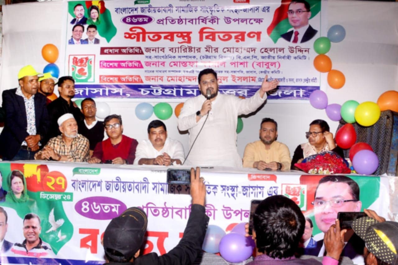 শহীদ রাষ্ট্রপতি জিয়াউর রহমান এর হাতে গড়া বিএনপির অঙ্গ সংগঠন বাংলাদেশ জাতীয়তাবাদী সামাজিক সাংস্কৃতিক সংস্থা- জাসাস এর ৪৬তম প্রতিষ্ঠা বার্ষিকী উপলক্ষে চট্টগ্রাম উত্তর জেলা জাসাস আয়োজিত অনুষ্ঠানে বক্তারা বলেন ভিনদেশী সাংস্কৃতিক আগ্রাসন থেকে দেশবাসীকে রক্ষা করতে শহীদ প্রেসিডেন্ট জিয়াউর রহমান জাসাস প্রতিষ্ঠা করেছিলেন, বাংলাদেশী সংস্কৃতিকে যাতে আমরা বিশ্ব দরবারে তুলে ধরতে পারি, এই লক্ষ্যে জাসাস কে কাজ করতে হবে , গত ১৭ বছর ভিন্ন সংস্কৃতি আমাদের দেশে সয়লাব হয়ে গেছে -বাংলাদেশের, গুণীজন, শিল্পী কবি, সাহিত্যিক সংস্কৃতি কর্মী, বুদ্ধিজীবী, শিক্ষক,সাংবাদিক এদেরকে কদর করতে হবে।। গত ১৭ বছর ভিন্নমত পোষণ করলেই অত্যাচার নির্যাতন করা হয়, এই অপশাসন এবং অপসংস্কৃতি রোধে জাসাস কাজ করে যাবে । প্রতিষ্ঠা বার্ষিকীর আলোচনা সভা ও শীতবস্ত্র বিতরণ অনুষ্ঠানে প্রধান অতিথির বক্তব্যে বিএনপির চট্টগ্রাম বিভাগীয় সহ- সাংগঠনিক সম্পাদক ব্যারিস্টার মীর মোহাম্মদ হেলাল উদ্দিন এসব কথা বলেন।