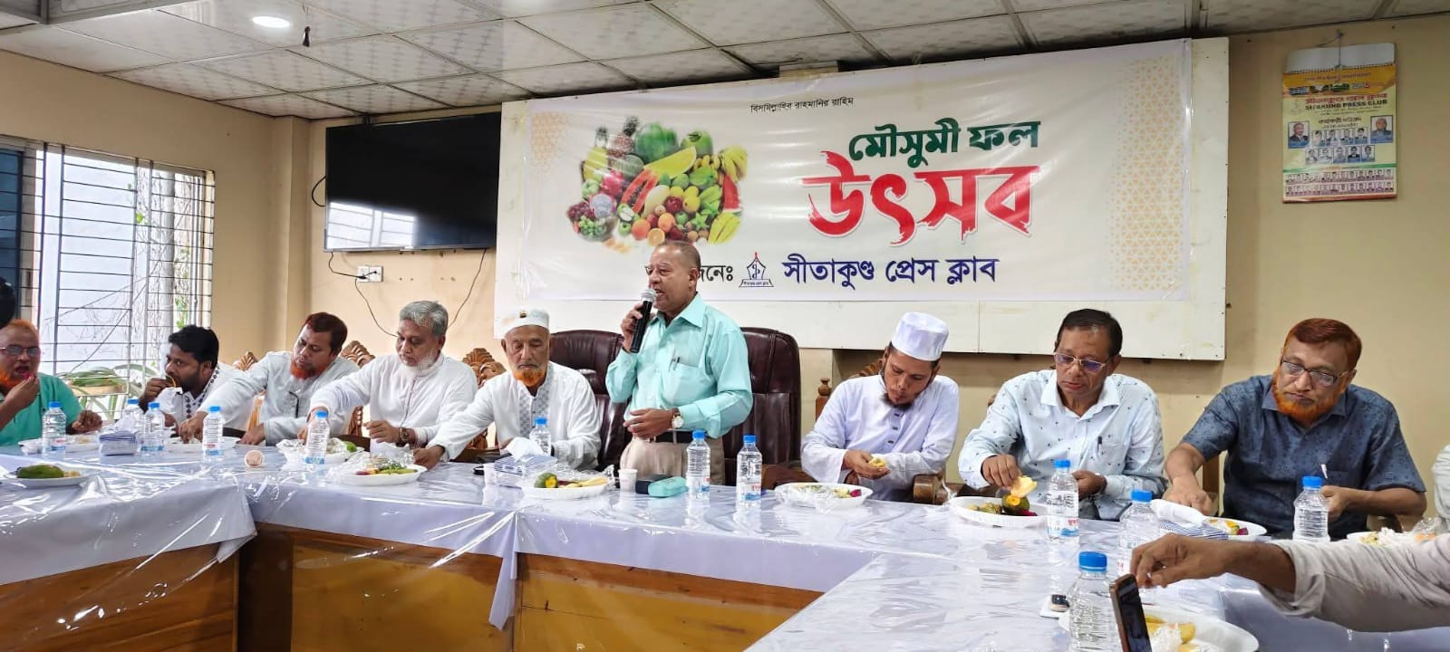 রঙ্গিন ফলের বর্ণিল উৎসব’ স্লোগানে সীতাকুণ্ড প্রেসক্লাব মৌসুমী ফল উৎসবের আয়োজন করেছে। নানান স্বাদের রঙিন ফলের বর্ণিল আয়োজনে উৎসবমুখর পরিবেশে চট্টগ্রামের সীতাকুণ্ড প্রেসক্লাবে আয়োজিত হয় ফল উৎসব। বৃহস্পতিবার বিকালে প্রেসক্লাবের কার্যালয়ে এ উৎসব অনুষ্ঠিত হয়৷ উৎসবে আম, জাম, কাঁঠাল, লটকন, লিচু, আনারস, পেয়ারাসহ প্রায় ১৫ ধরনের দেশীয় ফলের সমারোহ ঘটে। সীতাকুণ্ড প্রেস ক্লাবের সভাপতি সৈয়দ ফোরকান আবুর সভাপতিত্বে এবং সহ সাধারণ সম্পাদক নজরুল ইসলামের পরিচালনায় শুভেচ্ছা বক্তব্য রাখেন সীতাকুন্ড প্রেস ক্লাবের সাধারণ সম্পাদক কাইয়ুম চৌধুরী। অতিথি হিসেবে উপস্থিত ছিলেন উপজেলা বিএনপির আহবায়ক ডাঃ কমল কদর, উপজেলা জামায়াতের আমীর মাওলানা মিজানুর রহমান, সাবেক আমীর মৌলানা তাওহিদুল হক চৌধুরী, উপজেলা বিএনপির সদস্য সচিব কাজী মহিউদ্দিন, উপজেলা জামায়াতের সেক্রেটারি মোঃ তাহের, উত্তর জেলা বিএনপির সদস্য ও সাবেক কমিশনার শামসুল আলম আজাদ, উপজেলা শ্রমিক কল্যাণ ফেডারেশন সভাপতি মেজবাহুল আলম রাসেল, পৌর বিএনপির সদস্য সচিব ছালে আহমেদ সলু, জামায়াতের মিডিয়া সম্পাদক আবুল হোসেন, জুলাই যুদ্ধাদের স্বরণে বিশেষ দোয়া মোনাজাত পরিচালনা করেন অধ্যাক্ষ মাওলানা নুরুল কবীর।