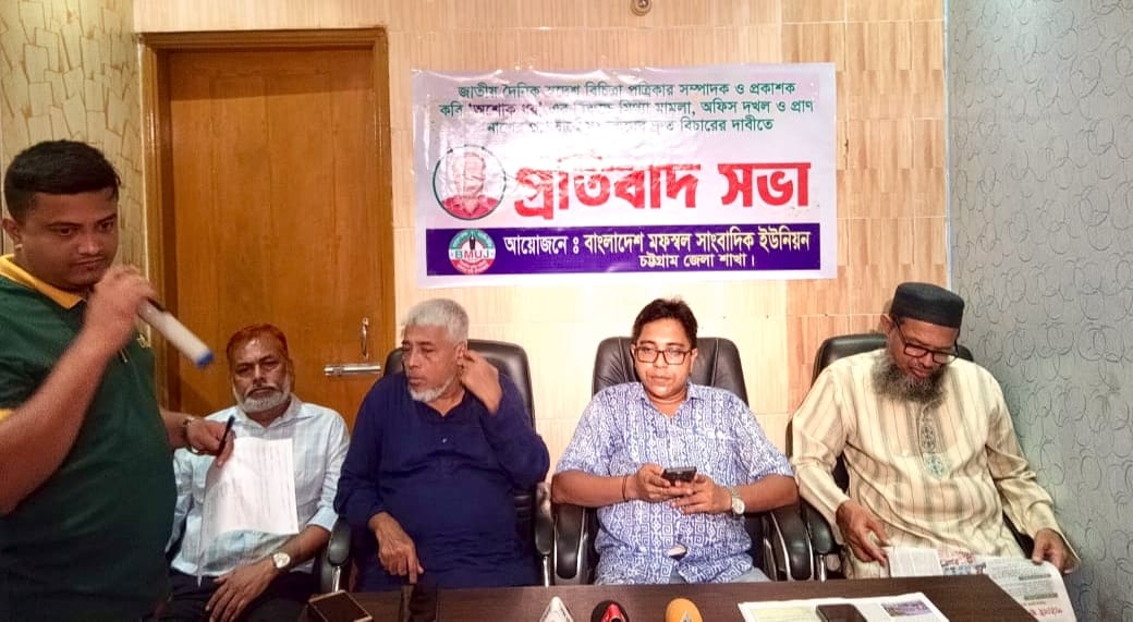 ২৮/৮/২০২৫ইং তারিখ নগরীর খুলশী থানা এলাকা চট্টগ্রাম বিটিভি র কেন্দ্রের বিপরীতে বাংলাদেশ মফস্বল সাংবাদিক ইউনিয়ন চট্টগ্রাম জেলা শাখার অস্থায়ী কার্যালয়ে দৈনিক স্বদেশ বিচিত্রা পত্রিকার সম্পাদক ও প্রকাশক কবি অশোক ধরের উপরে হামলার ও অফিস দখল ও মিথ্যা মামলা প্রান নাশের প্রতিবাদে সভা অনুষ্ঠিত হয় , মফস্বল সাংবাদিক ইউনিয় চট্টগ্রাম জেলা শাখার সভাপতি শহিদুল ইসলামের সভাপতিত্বে হুমায়ুন কবির রাব্বির সঞ্চালনায় প্রতিবাদ সভায় প্রধান অতিথি হিসেবে উপস্থিত ছিলেন বাংলাদেশ মফস্বল সাংবাদিক ইউনিয়ন কেন্দ্রীয় কমিটির সাংগঠনিক সম্পাদক সাংবাদিক নেতা সোহাগ আরেফিন বিশেষ অতিথি হিসেবে উপস্থিত ছিলেন দৈনিক স্বাধীন সংবাদ পত্রিকার উপদেষ্টা সম্পাদক নুরুল আফছার তৌহিদ ও দৈনিক স্বাধীন সংবাদ পত্রিকার সহ-সম্পাদক আলহাজ্ব বেলাল আহমেদ ও চট্টগ্রাম রিপোর্টার এ এসোসিয়েশনের সাংগঠনিক সম্পাদক মোঃ রুবেল,আরো উপস্থিত ছিলেন সাংবাদিক জহিরুল ইসলাম, সাংবাদিক নাসির উদ্দিন লিটন, মহিউদ্দিন সাগর, মাজাহারুল ইসলাম রানা, শাহাদাত হোসেন, শাহরিয়ার সুমন, সাংবাদিক মোশাররফ হোসেন মাসুদ, নূরনবী, মোহাম্মদ রাজিব, আসিফুজ্জামান, বিল্লাল হোসেন, হেলাল উদ্দিন, সোহেল রানা, সোহেল, হৃদয় সর্দার, আসিফ সহ আরো অন্যান্য সাংবাদিকবৃন্দ।
