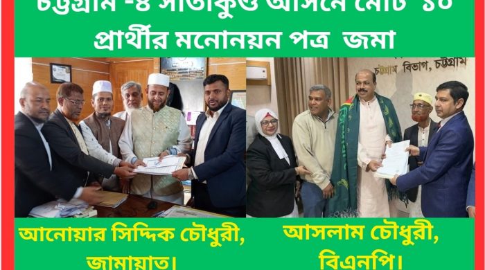জসিম উদ্দীন ফারুকী, বিশেষ প্রতিনিধিঃ আসন্ন জাতীয় সংসদ নির্বাচনে চট্টগ্রাম-১৪ (চন্দনাইশ-সাতকানিয়া আংশিক) সংসদীয় আসন থেকে বিভিন্ন রাজনৈতিক দল ও স্বতন্ত্র প্রার্থী হিসেবে মোট ৯ জন প্রার্থী তাদের মনোনয়নপত্র দাখিল করেছেন।